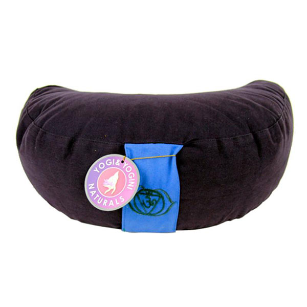Halbmondförmiges Meditationskissen mit Reißverschluss und Innenkissen. Der 5cm breite Tragegriff ist mit dem Symbol des 6. Chakras bestickt.