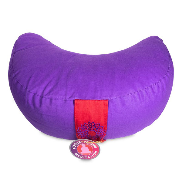 Halbmondförmiges Meditationskissen mit Reißverschluss und Innenkissen. Der 5cm breite Tragegriff ist mit dem Symbol des 7. Chakras bestickt.