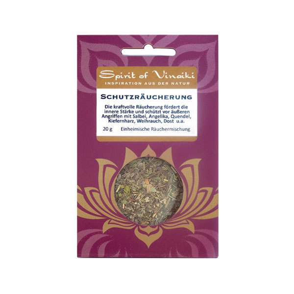 Fördert die innere Stärke und schützt vor äußeren Angriffen. Mit Salbei, Angelikasamen, Quendel, Copal u. a.